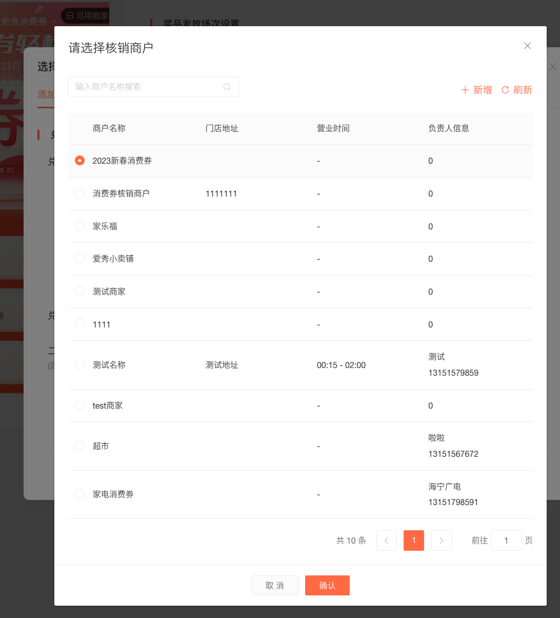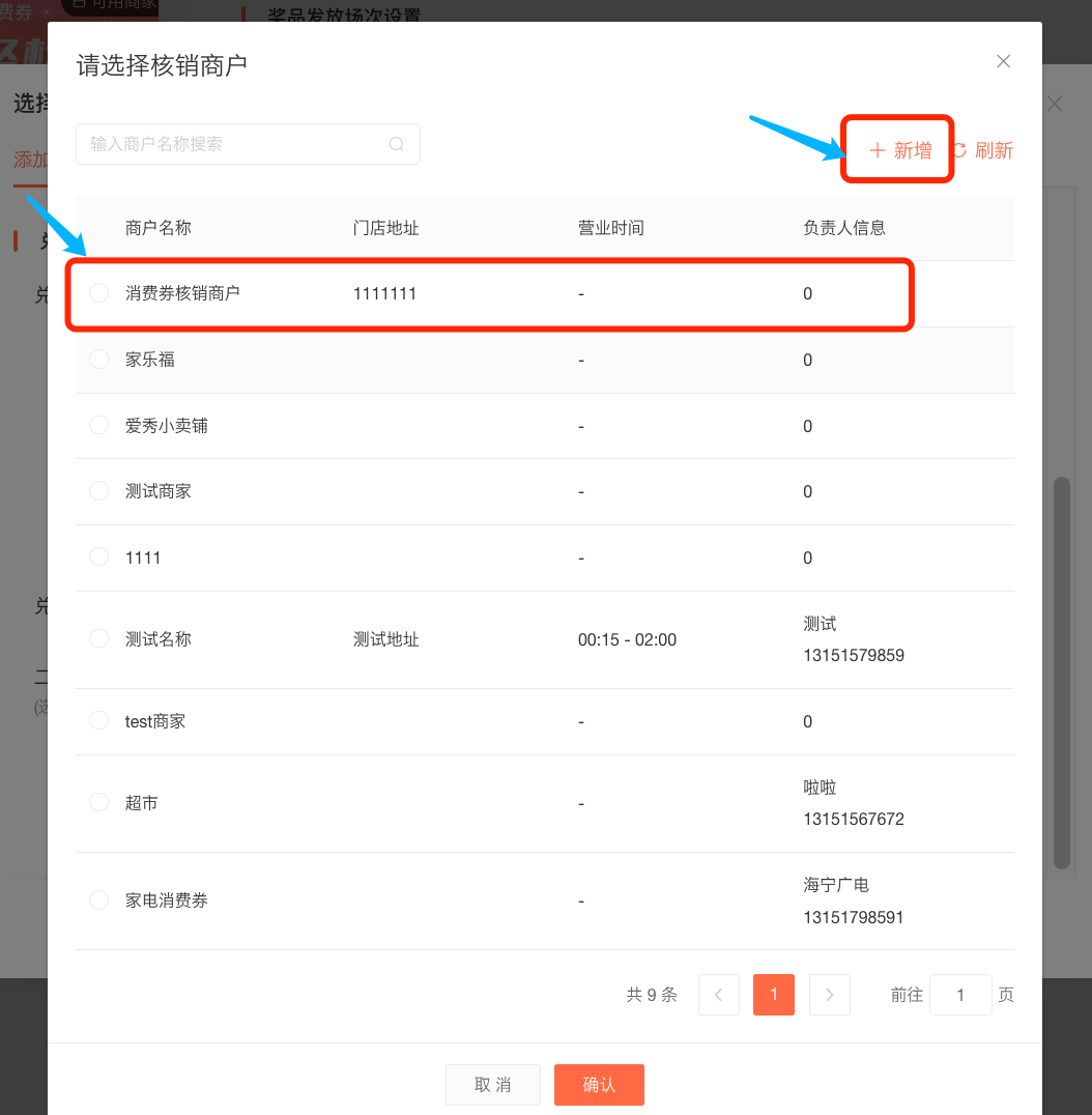 选择消费券核销商家可以从过往商户中选择,如果过往商户中不满足本次活动核销需求,可以选择新增核销商户。点击「新增」按钮,即可创建核销商户。