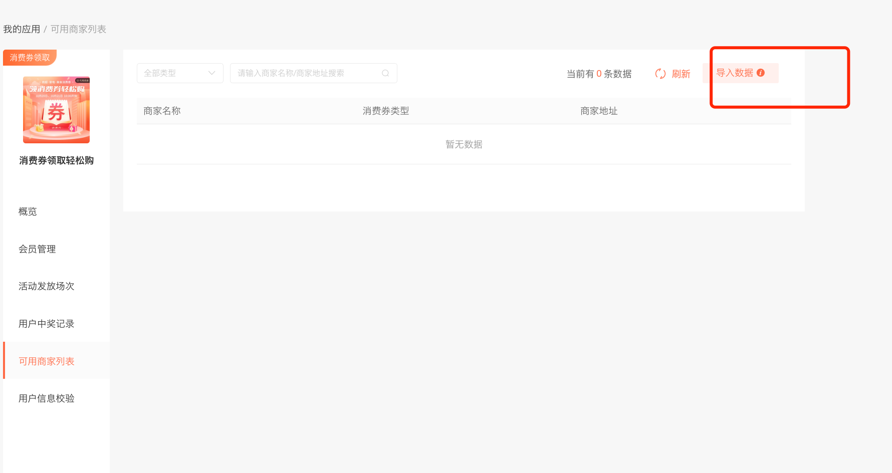 可在可用商家列表中进行导入商家列表,便于用户在前端进行查看,消费券可使用的商家类型。