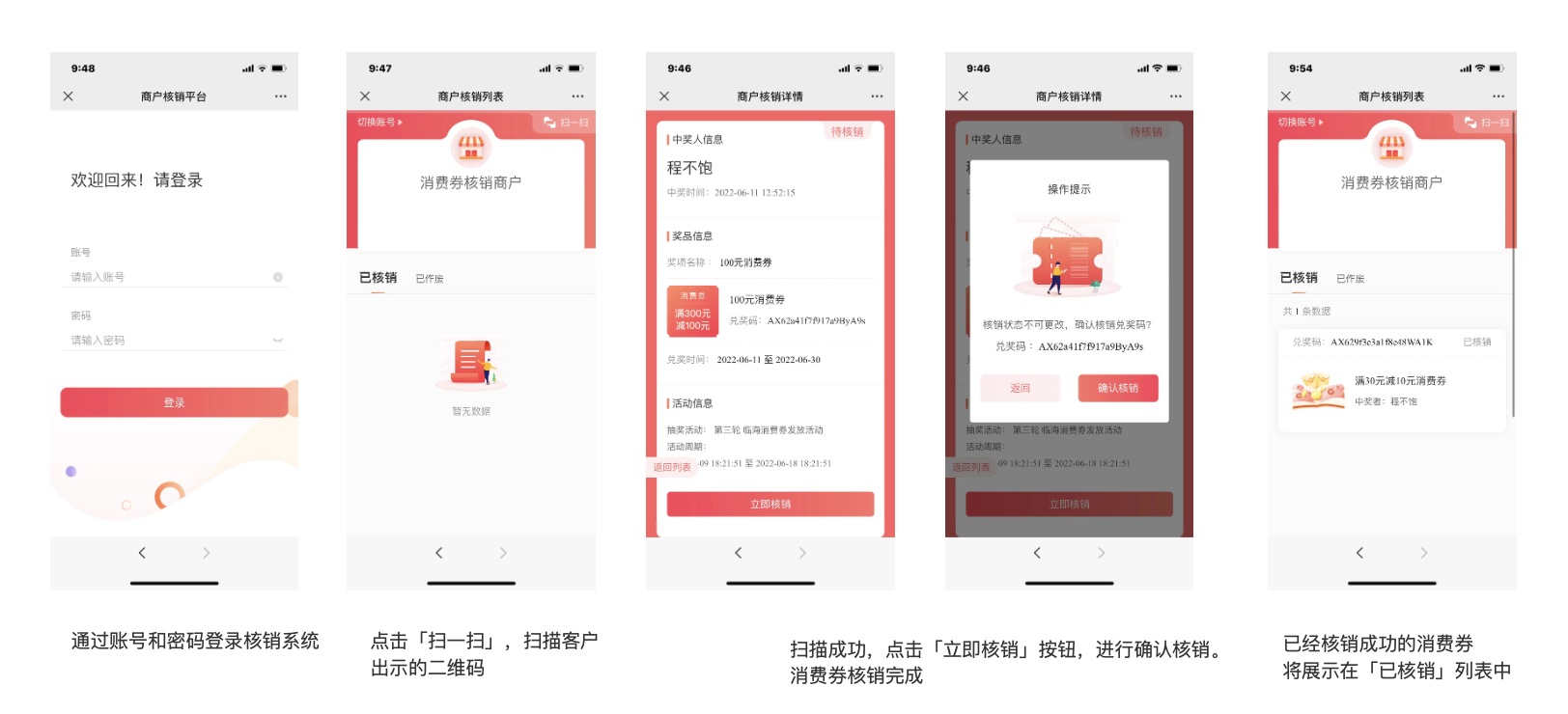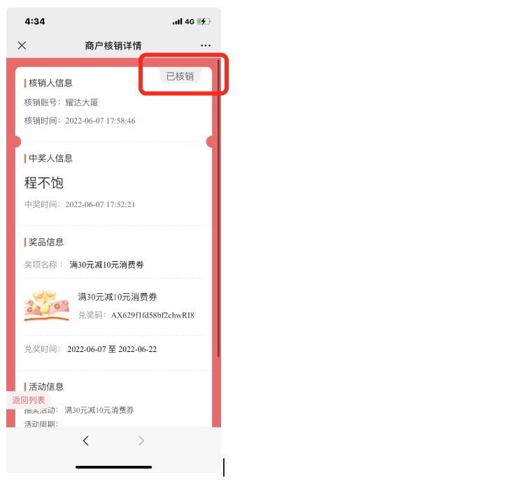 当用户使用消费券完成商品交易后,产生退款行为。商家需再次扫描该客户的核销二维码,点击「作废」按钮,将消费券进行作废处理。