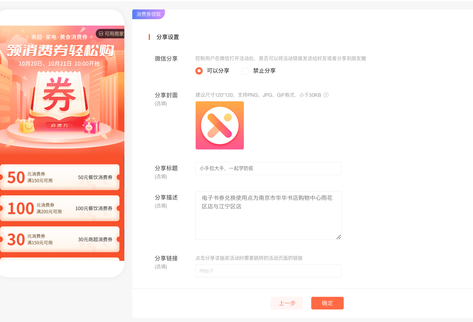 依次填写完成【微信分享】【分享封面】【分享标题】【分享描述】【分享链接】点击「确认」,活动创建成功。